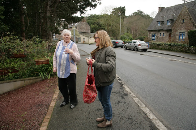 Temps gris, se retrouver à 14h sur le parking avec Anne-Marie. Ne nous souvenons plus très bien de la maison sur la route qui traverse Kérity. Après quelques hésitations, essayer de passer le portail blanc d’une maison, fermé, frapper à la porte qui donne dans la rue, rien. Anne-Marie se souvient du numéro de téléphone de madame Baron. Entre temps porte s’ouvre, une dame sort… Erreur sur la maison, pas la bonne personne, s’excuser, pouffer de rire. Au loin, une dame apparaît sur la rue, c’est elle !